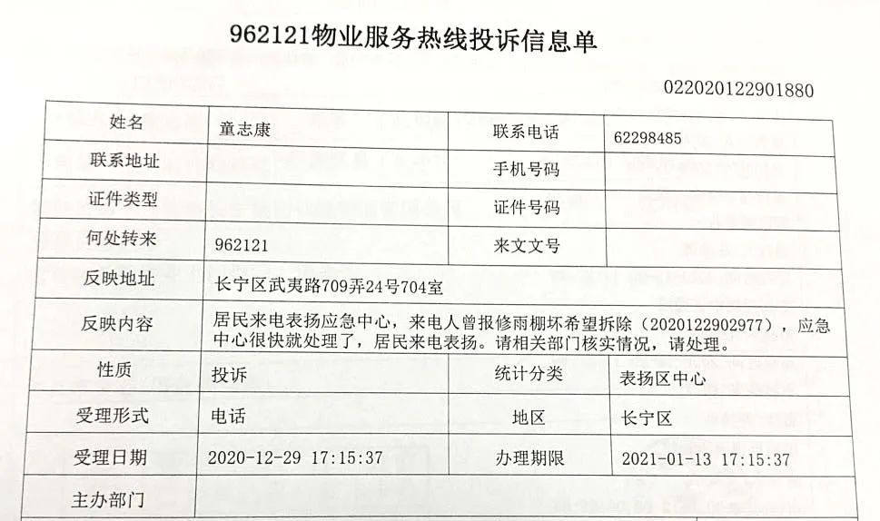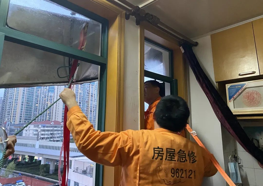 12月29日,长宁962121物业服务热线接到居民报修,武夷路709弄某号7楼家中雨棚松动有脱落危险。热线接单后,派单至长宁区房屋维修应急中心。应急中心立即派出技能娴熟、经验丰富的维修师傅赶赴居民家中。在到达居民家后,师傅进行仔细查,确认不锈钢雨棚确实存在老化松动现象,有坠落危险。窗外风大雨大,师傅们立即制定应急方案,排除险情,保障居民安全。
