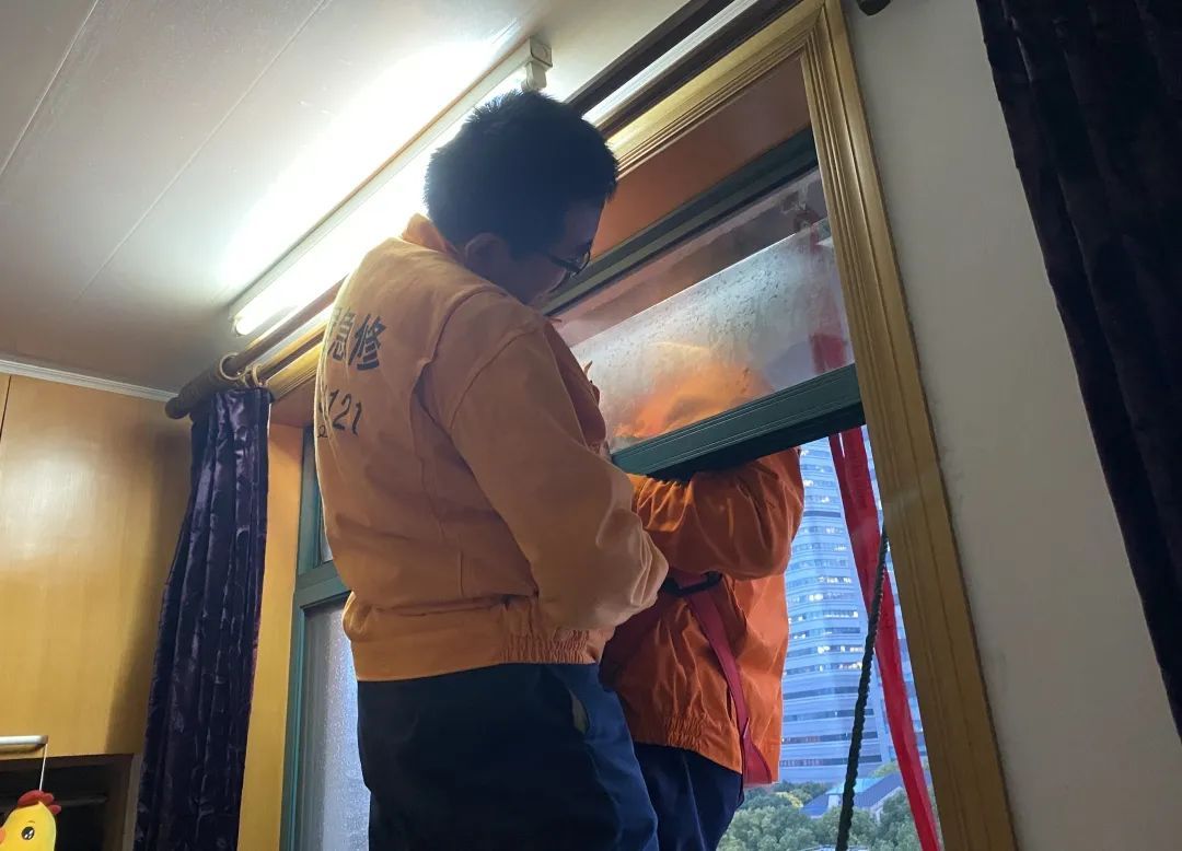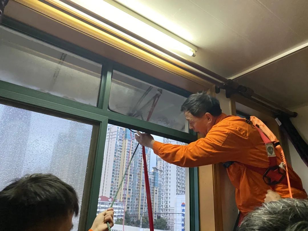 师傅需要对雨棚进行整体拆除,在做好相应的高空防护措施后,师傅不顾楼高、屋外温低、风大、雨大,窗台湿滑等危险,胆大心细翻至屋外进行拆除。