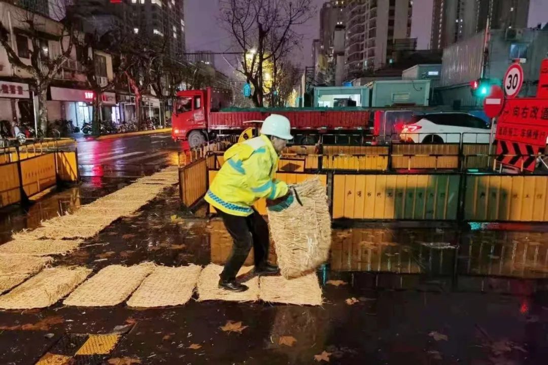 12月29日晚上全体出动应急抢险人员,加强路面巡逻。当晚对新天地施工区域铺设钢板部位采取了预铺麻袋等措施。12月30日凌晨,对打浦路、淮海中路人行天桥的薄冰及时予以清除,并铺设草包和麻袋,在交通早高峰来临前及时消除安全隐患。累计出动应急抢险人员50人次,车辆6辆次,使用工业盐500公斤、草包麻袋300余只。