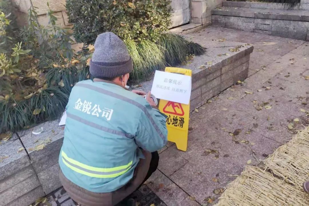 各项目对暴露水管进行保温包扎,对公共绿化采取防风防冻措施,对消防设施进行了防裂围护。同时主动与业主单位对接,做好防冻保暖指导和宣传工作。12月29日晚-12月30日早间,针对管理区域内的多处结冰,及时组织人员加班加点予以清除,确保公众出行安全。