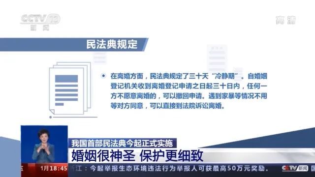 在离婚方面,民法典规定了三十天“冷静期”。自婚姻登记机关收到离婚登记申请之日起三十日内,任何一方不愿意离婚的,可以撤回申请。要注意,遇到家暴等情况不用等对方同意,可以直接到法院诉讼离婚。