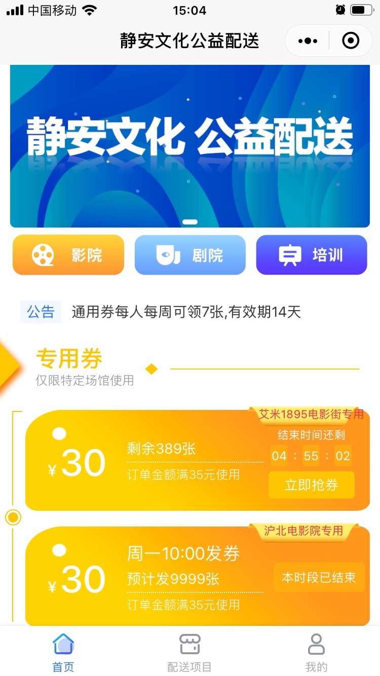 “静安文化公益配送”微信小程序每天会发放公益配送券。沪北电影院的专用券每人每月(自然月)可领12张,当日有效;艾米1895电影街的专用券每人每12天可领取9张,当日有效。