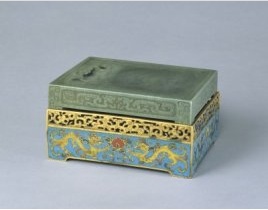 清代内廷制作的御用暖砚一般以铜、铁、锡、银为砚匣,并镀金或镂空錾刻纹饰,工艺精湛。如故宫博物院收藏的康熙年间松花江石夔龙纹暖砚,砚体为青绿色松花江石所制,通体光滑,四脚处各有一兽面纹方足。砚面上沿边缘有阴刻方框,内雕荷叶状墨池,池边有一小孔用于蓄水。砚堂凹陷。砚体四侧各雕凹底阳纹两两相对的夔龙纹。砚下置掐丝珐琅夔龙纹暖砚盒,长方形,口部饰铜镀金錾花螭纹一周,四立面为浅蓝色珐琅地,每面中间用桃纹作装饰,两旁饰相向的掐丝螭纹一对。掐丝线条工整,珐琅质地细腻,色彩淡雅。
