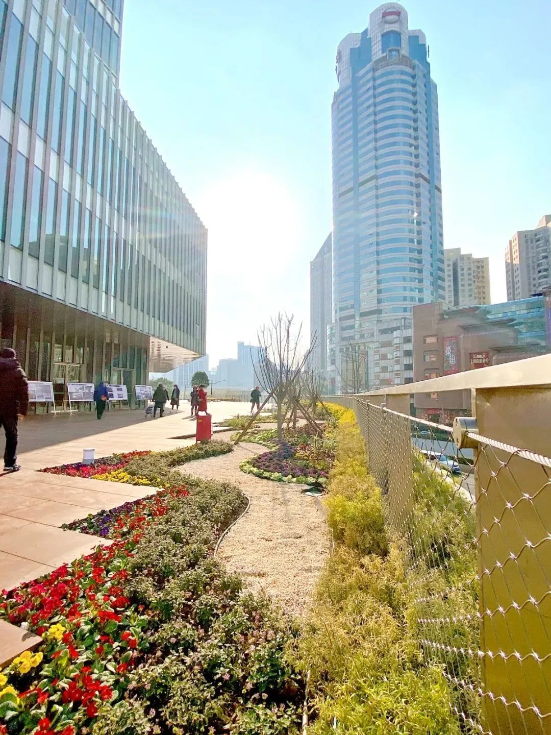 连廊绿化以地面绿化、桥上绿化、花箱绿化三种形式相结合。桥面绿化引进了黄金香柳、玫红蒲苇、佛甲草等植物种类,不锈钢围栏上则穿插了藤本月季等一年可开两、三季花的藤本植物。
