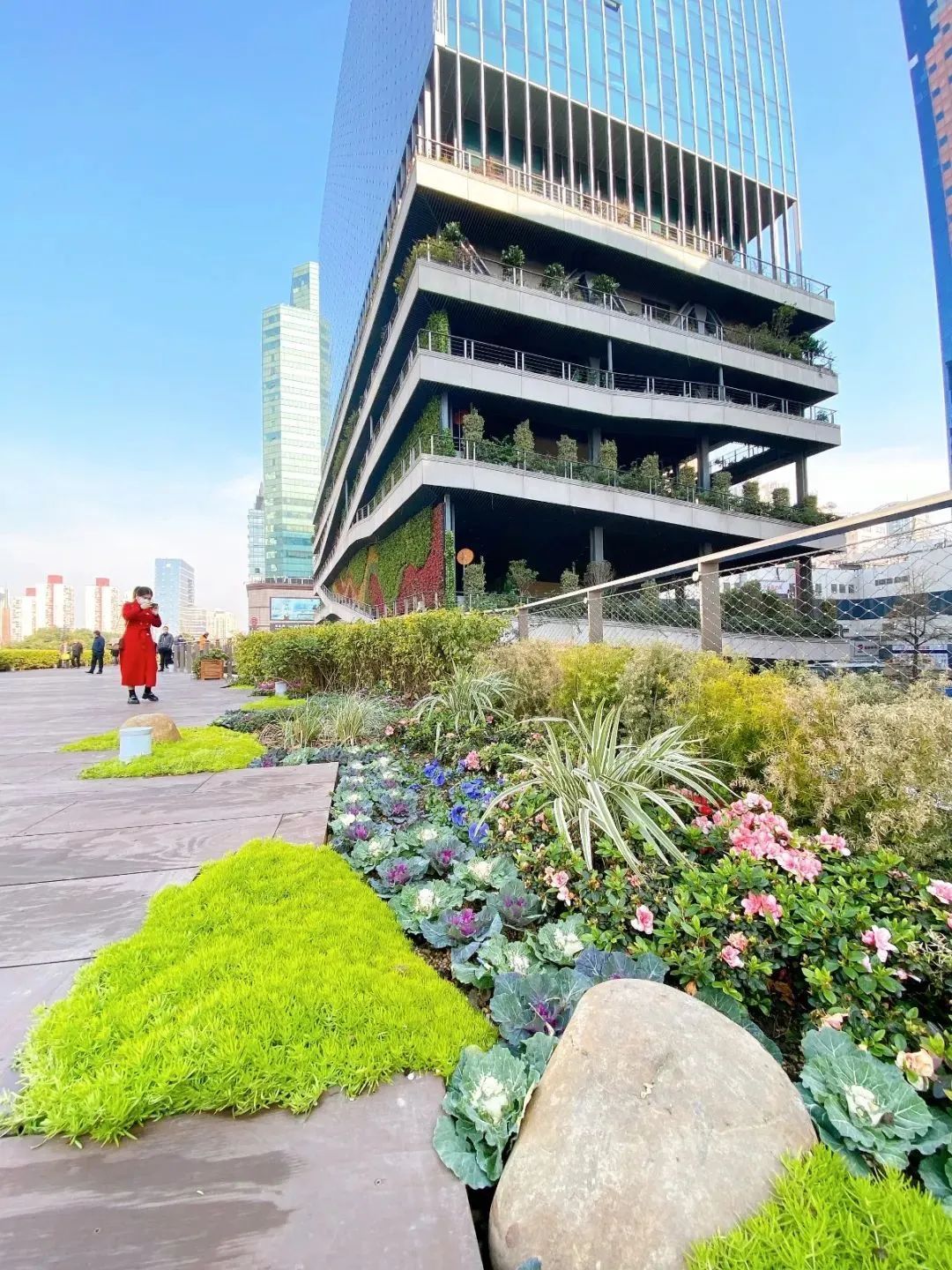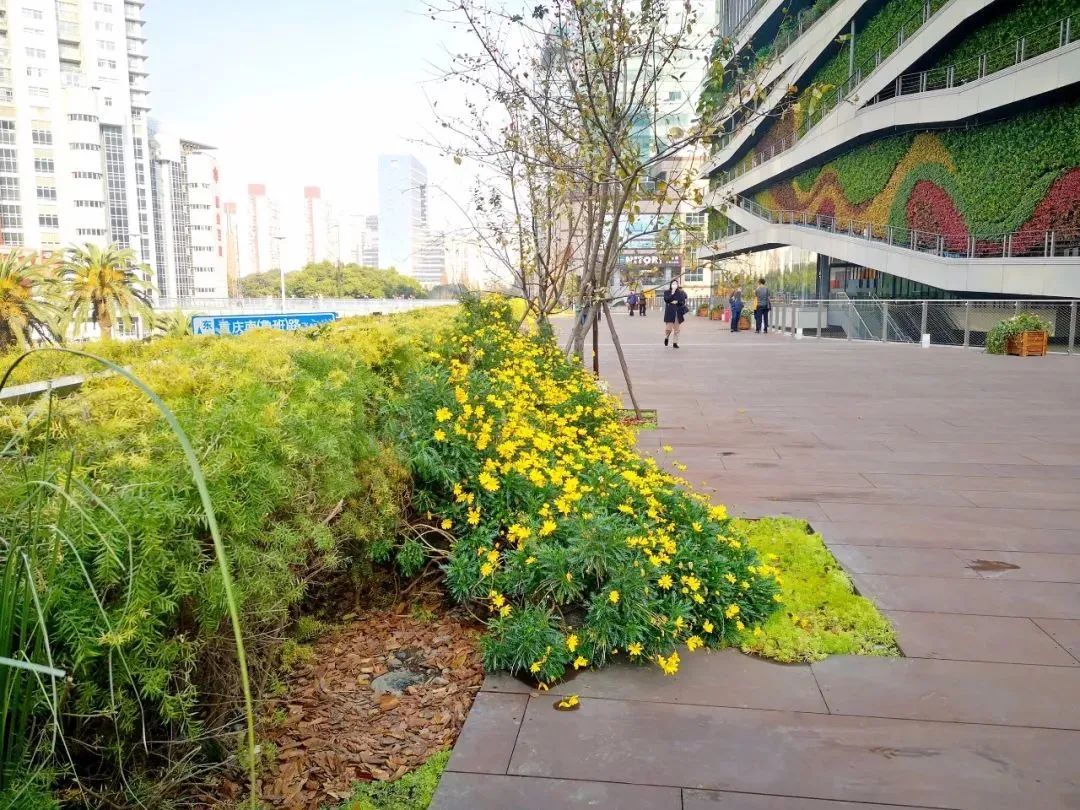 连廊绿植的生长方式并非普通天桥常见的规整姿态,而是略带狂野 “放飞自我”的姿势。茂密的绿植已渐渐将护栏遮掩,一看望去,一路有树,有草,有花,是都市空中难得的绿色大阳台。
