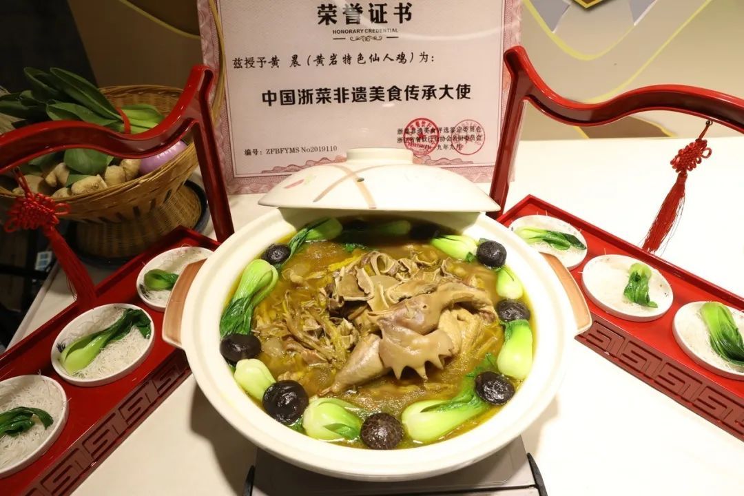 浙江省非物质文化遗产黄岩特色仙人鸡也是来台州不得不尝的美味之一。这道菜采用一种非常罕见的加热方法“隔火炖”烹制,这种烹制方法如今只在吴语语系里还有保存。为了保证它浓郁的香味和恰到好处的口感,仙人鸡里每一种配料,每一种食材都经过精心挑选。铺于锅底的生姜要选用新姜而非老姜;要挑选至少下过两次蛋的老母鸡;猪脚要用炒好的海盐腌制两个晚上……新鲜的姜汁跟鸡汤融合得恰到好处,经过海盐腌制的猪脚跟鸡汤融合后变得更加醇厚。鸡汤入口先是辛辣,而后辣味慢慢散开,一股鲜甜涌上舌尖,一碗汤下肚,浑身变得暖融融。