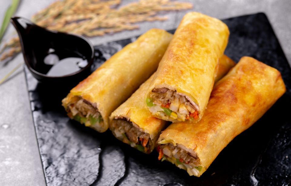 饺饼筒的馅料丰富多彩,豆芽、蛋丝、豆腐干、豆面、红烧肉、鱿鱼、虾仁……裹进软糯的饼皮中,再把皮两头兜起来卷好。饺饼筒包好了要放在“鏊”上煎一煎,一直要放到外表皮呈金黄色并油光发亮。咬一口,外酥里嫩,松松脆脆,各种馅料唱起了交响曲,香味四溢,让人吃了一口还想再吃第二口。