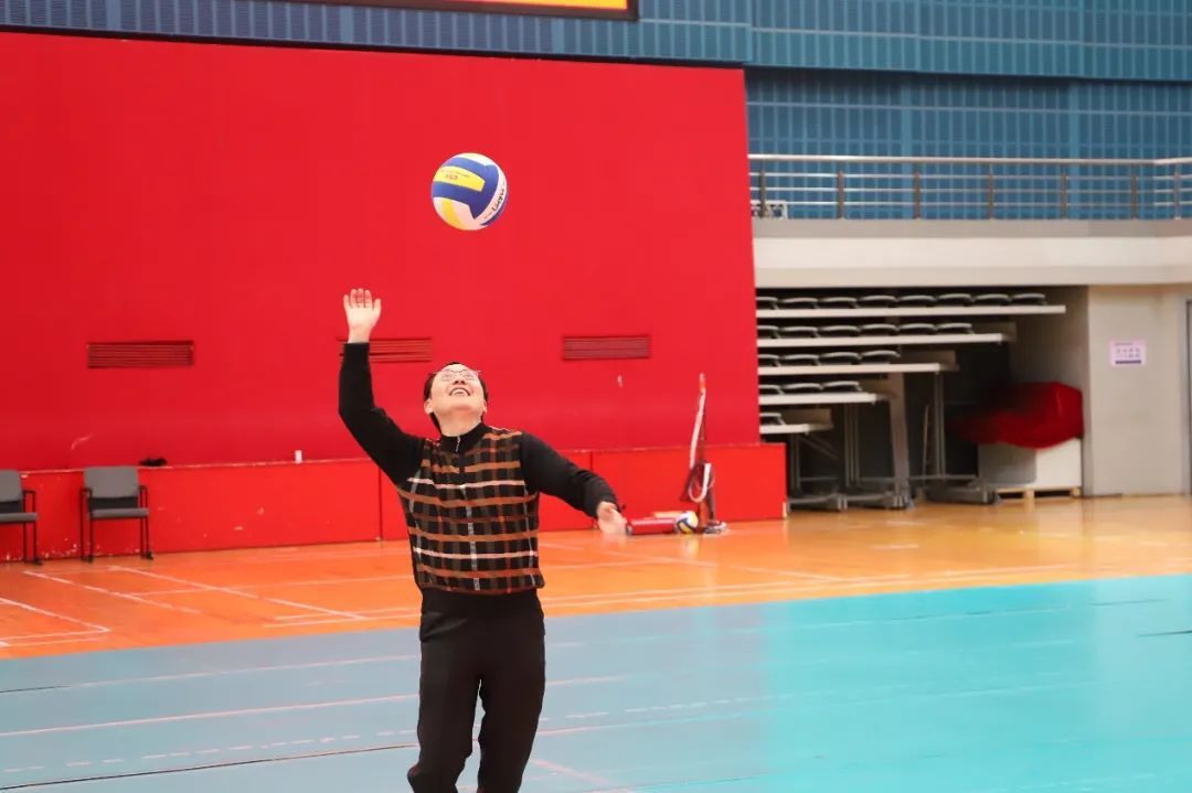 会议结束,大家移步正大体育馆排球场合影留念,并观看教工排球精英赛。