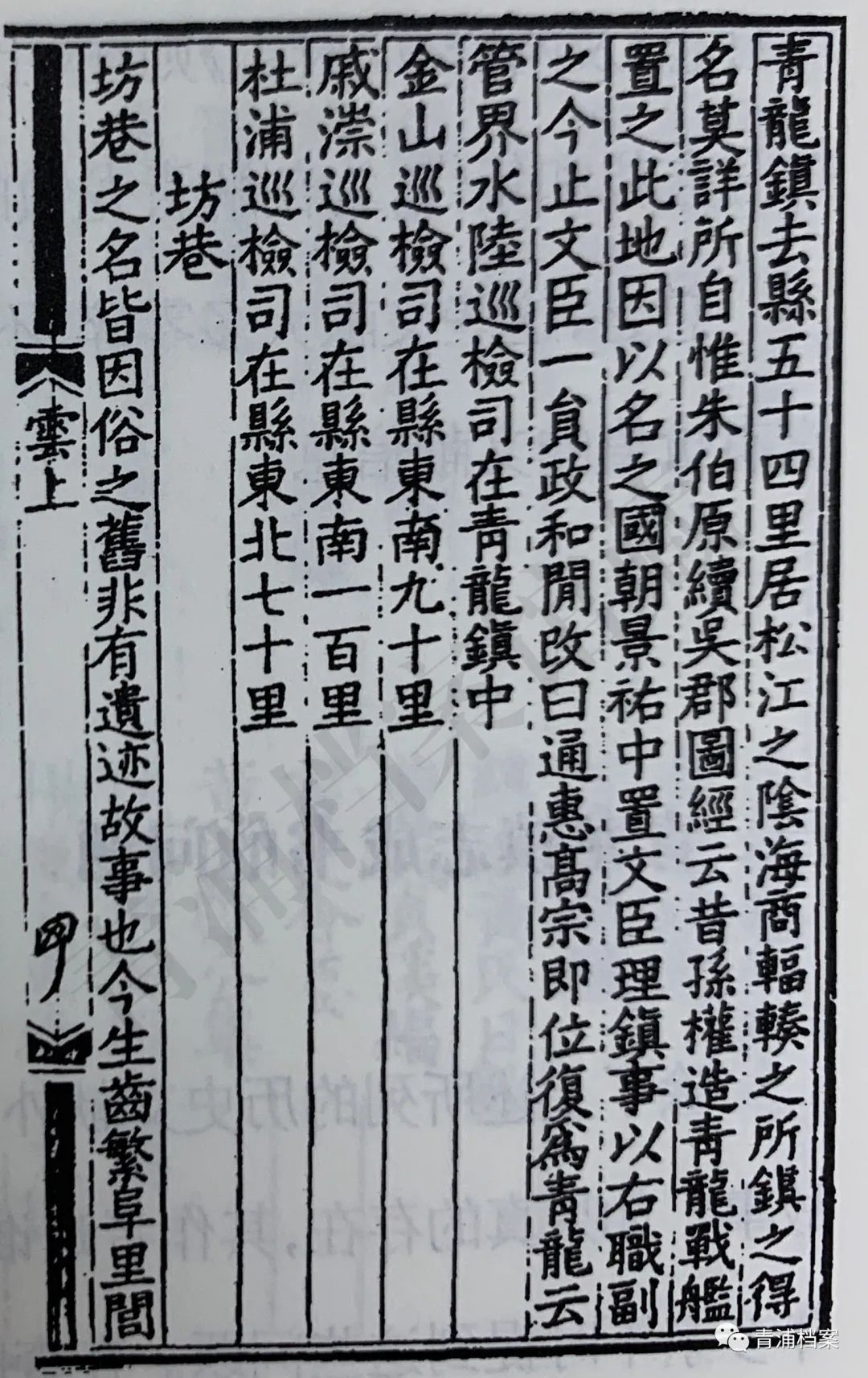 青龙镇之名的出现,目前发现最早的历史文献是成书于北宋元丰三年的《元丰九域志》,其卷第五“两浙路”中提到:“华亭……青龙一镇”,仅记录了青龙镇之名,未载镇名的由来。