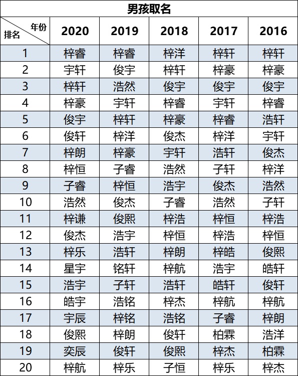 男孩取名为“梓睿”的最多