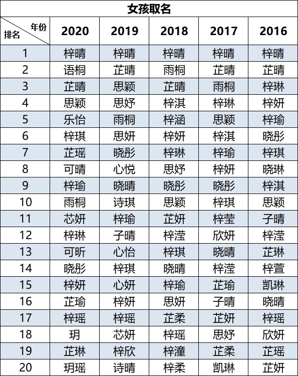 女孩取名最多的是“梓晴”