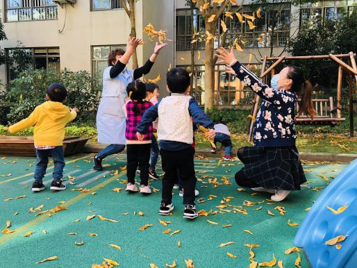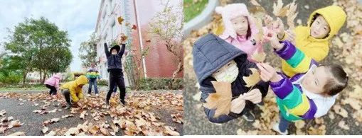 廊下幼儿园:大自然的馈赠,树叶纷纷扬扬落下。与树叶做游戏,孩子们说“下树叶雨咯!”