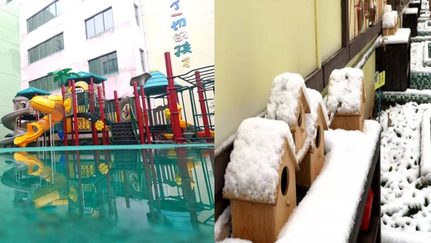 上海“儿童世界”基金会长宁幼儿园:当冬日的校园遇上雨天、雪天,是另一番美景。