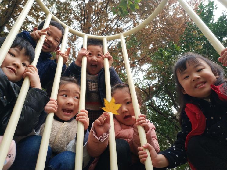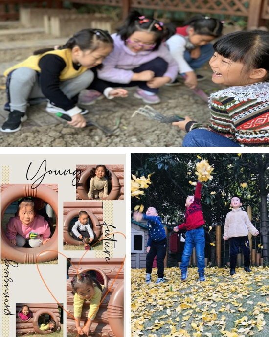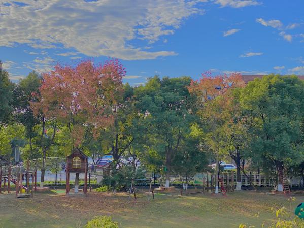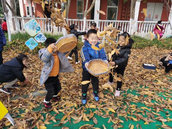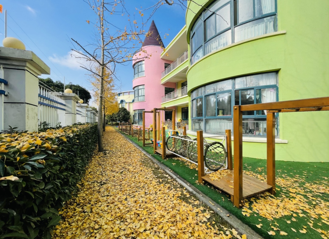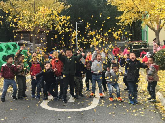 吕巷幼儿园:操场上满片满片的金黄色树叶,是孩子们游戏的乐园。