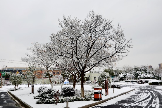 亭林中学:难得一见的新雪厚厚地压在枝头,在腊梅素净的香气里,亭中校园裹上了洁白的冬装。