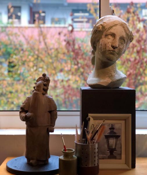 丰庄中学:校园泥塑苑中,学生捏塑的“戏曲泥人”与窗外初冬金黄的树叶相映成趣。