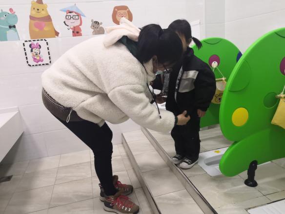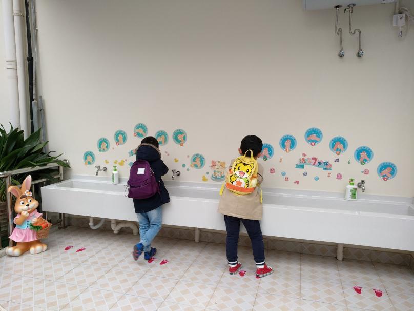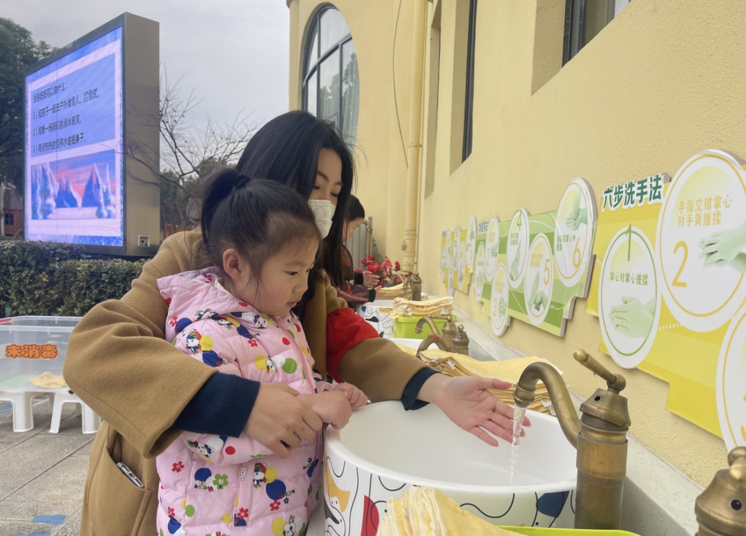 金悦幼儿园:细心的老师在孩子们洗手前调试水温。