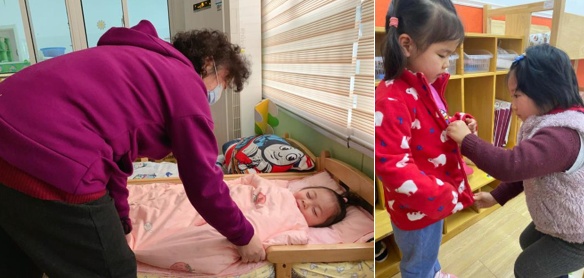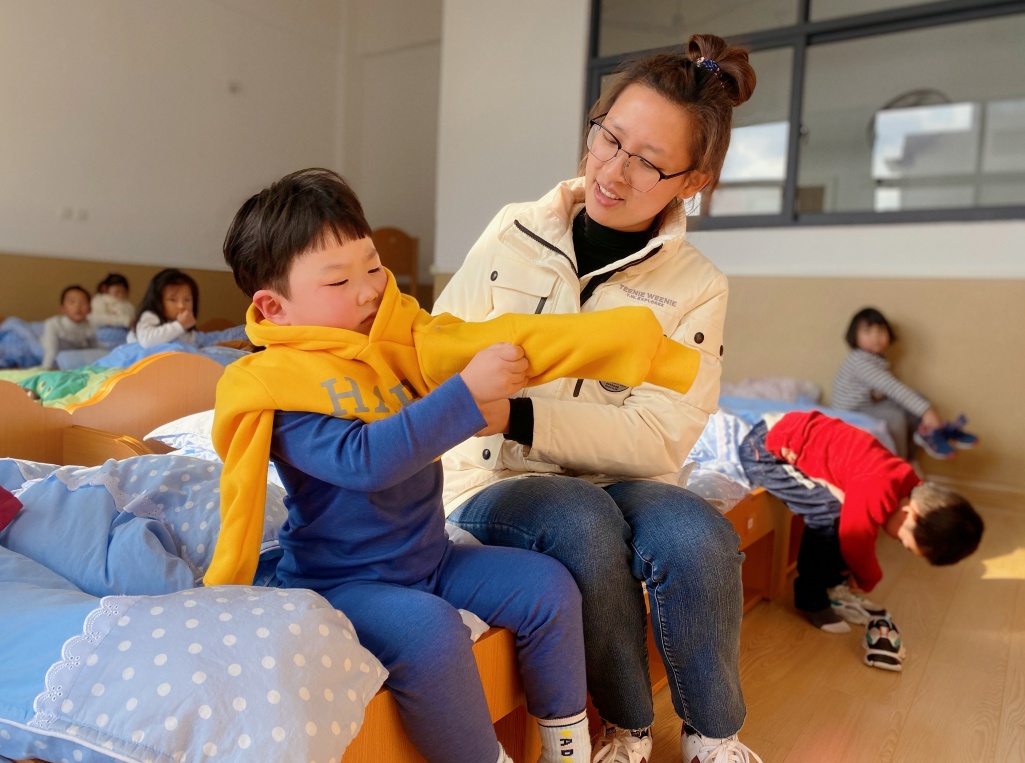 前京幼儿园:老师们替孩子们整理好衣服,保护好每个小朋友的身体……