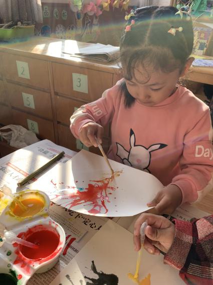 钱圩幼儿园:小朋友正用细竹筒正在进行吹画创作。一抹阳光照在她身上,衬托着她的认真。