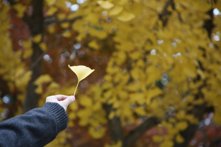 片片银杏,飘落一地金黄;点点翠绿,幽幽抱蕊吐芳。