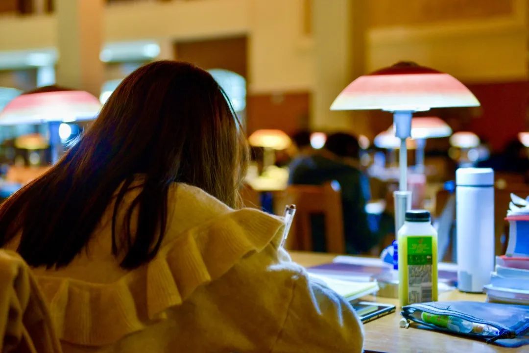 冬日,凉意笼罩校园,图书馆内暖意融融,灯影下同学们学习的身影格外动人。