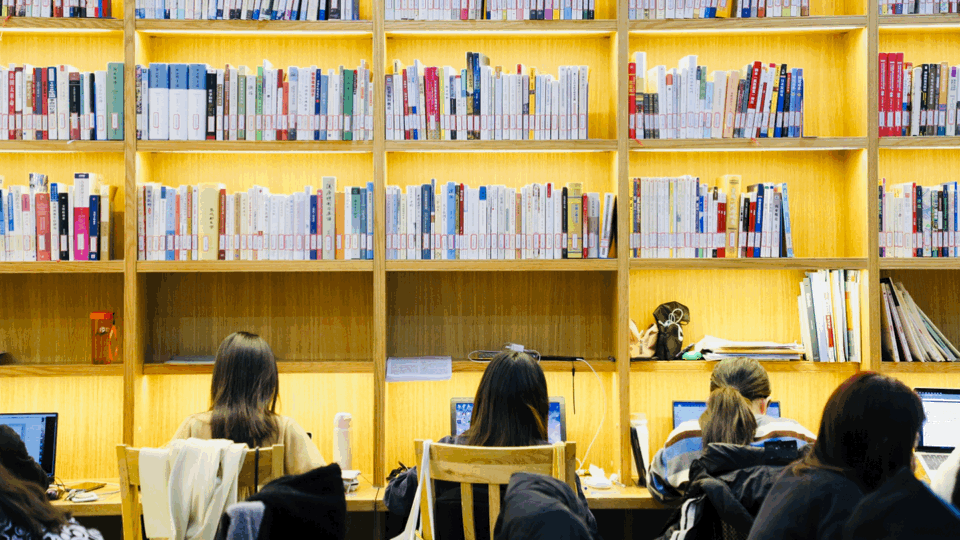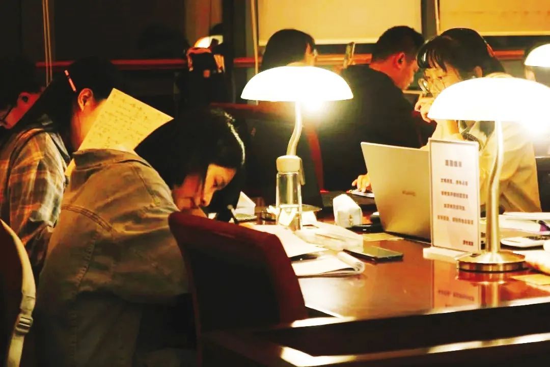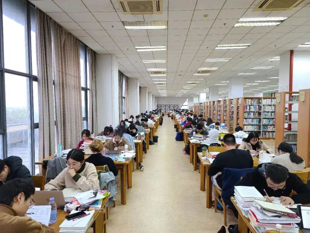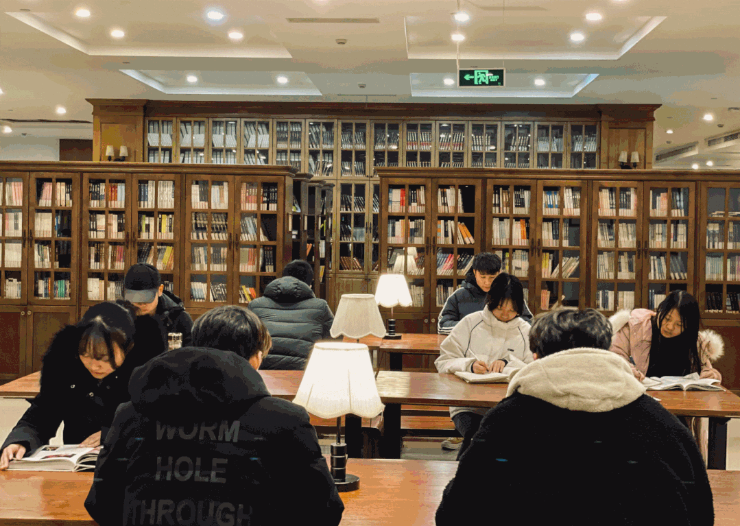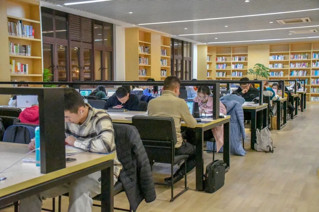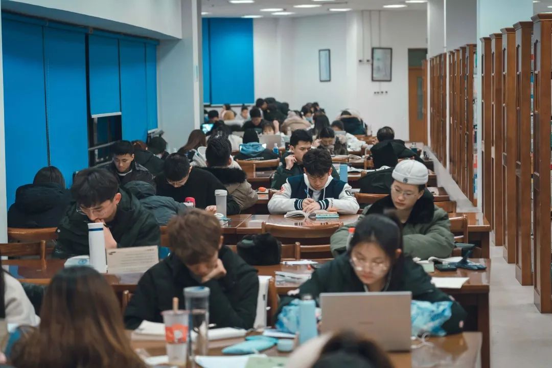 寒冬的夜,上海工商外国语职业学院图书馆内别样温暖,书堆成山的各阅览室中,学生们或奋笔疾书,或复习备考。