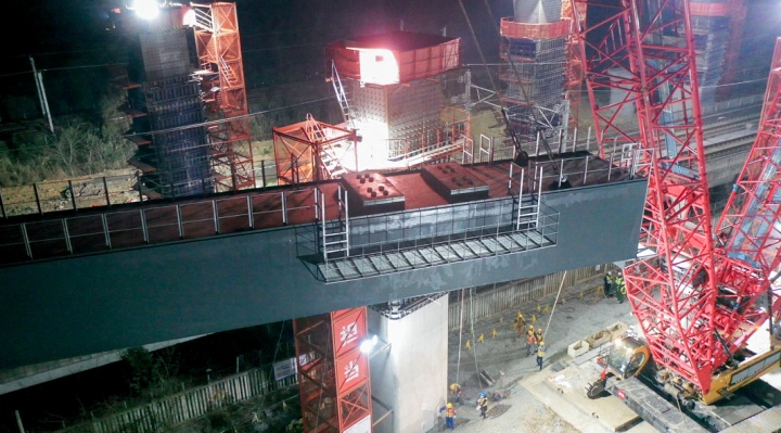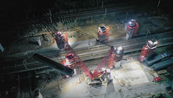 湖州特大桥左单线26#门式墩钢盖梁为沪苏湖铁路第一片钢横梁吊装,采用钢门式墩上跨宁杭高铁,钢梁采用箱形截面,钢梁高2.8m、宽3.3m、长27.4m,跨径为24m。