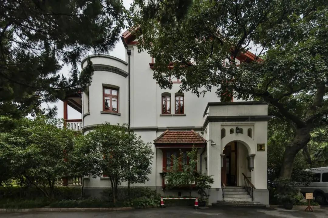 花园之东的1号楼为主楼,是上海第一幢西式花园住宅。这是一幢面向宽阔草坪的英国乡村式假三层小楼,红的木柱与白的栏杆错落有致,使洋楼掩映在郁郁葱葱的花木之中。
