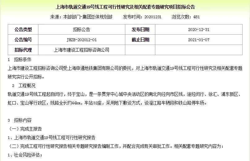 日前,上海市轨道交通19号线工程可行性研究及相关配套专题研究项目招标公告发布了。