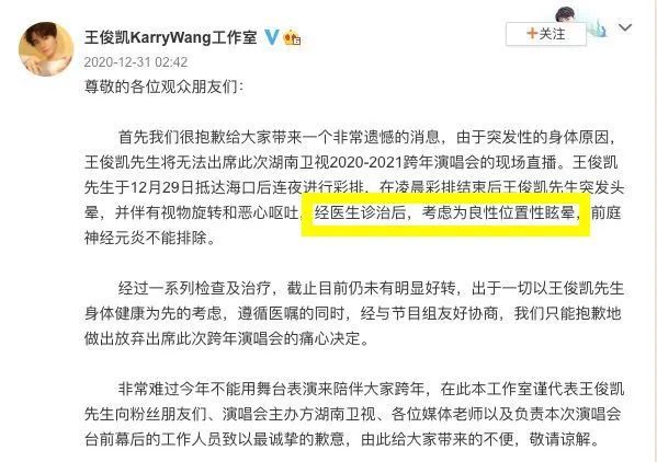 知名艺人王俊凯工作室称其2020年12月29日抵达海口后连夜进行彩排,凌晨结束后突发头晕,并伴有视物旋转和恶心呕吐,经医生诊治后,考虑为良性位置性眩晕,前庭神经元炎不能排除。