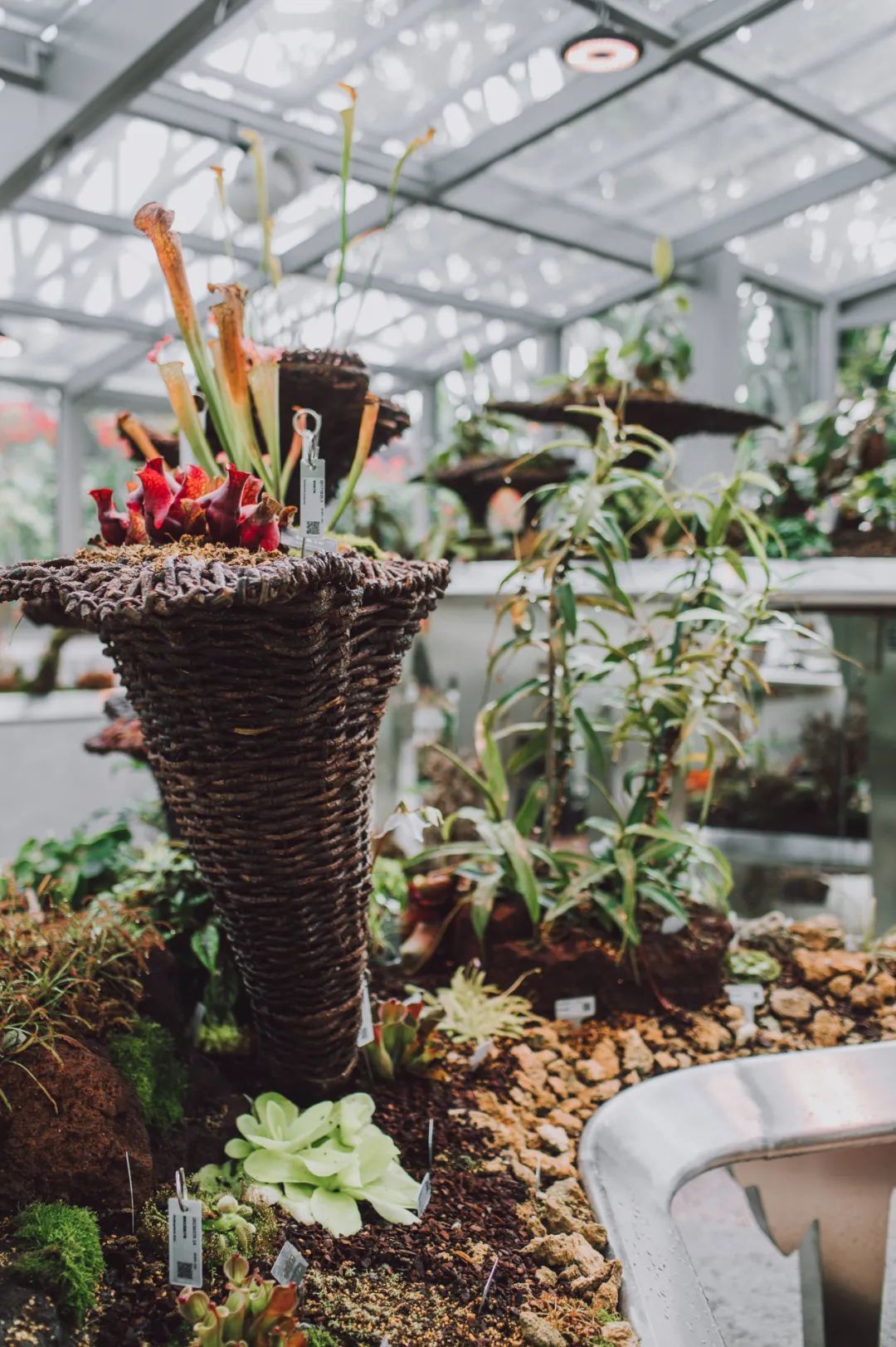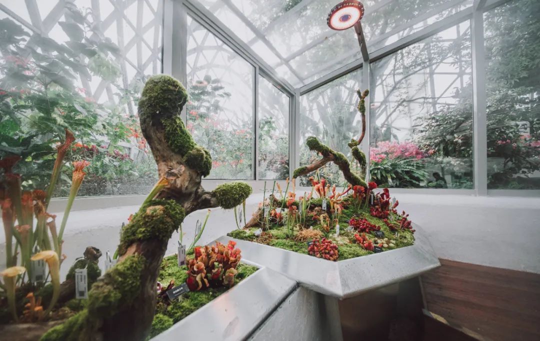 食虫植物是一个稀有的类群,大约有10科21属630余种,大多生活在高山湿地或低地沼泽中。食虫植物对栽培环境要求较高,因此为了满足食虫植物的生长需要,打造适宜食虫植物生长的环境,辰山植物园在食虫馆内专设温控系统、喷雾、补光灯、循环风扇灯等设施设备。