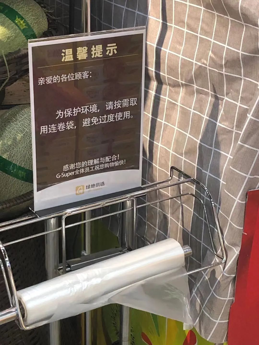 但用于散装货品包装称重的连卷袋旁,会有“温馨提示”的告示牌,提醒顾客按需取用,避免浪费。超市内也会时不时地播放关于“今后将不再提供塑料购物袋,建议您自带环保购物袋,如需购买可至服务台购买无纺布袋”的广播。