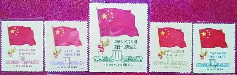 在中华人民共和国成立一周年的1950年10月1日, 中国邮政发行了 5 枚一套的五星红旗(纪6)纪念邮票,面值分别为人民币(旧制)100元、400元、800元、1000元和2000元。其中800元面值是用于寄外埠的平信,不仅发行量最大,而且比其他四枚大近三分之一!每次取出老纪特邮册欣赏邮票时,我都会情不自禁向这五面五星红旗行注目礼,同时,回忆自己担任升旗手和在天安门广场观看升五星红旗的那个庄严幸福的时刻。
