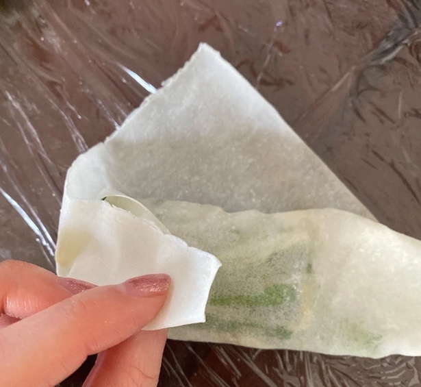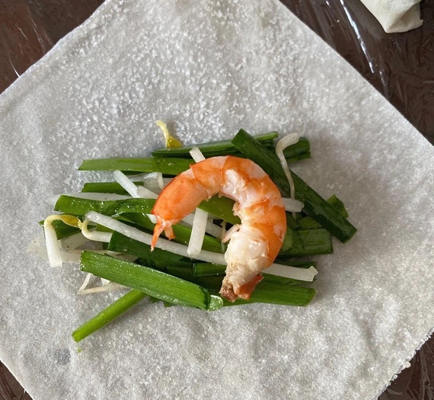 1. 取一张春卷皮,以韭菜和豆芽为底,虾仁置顶。