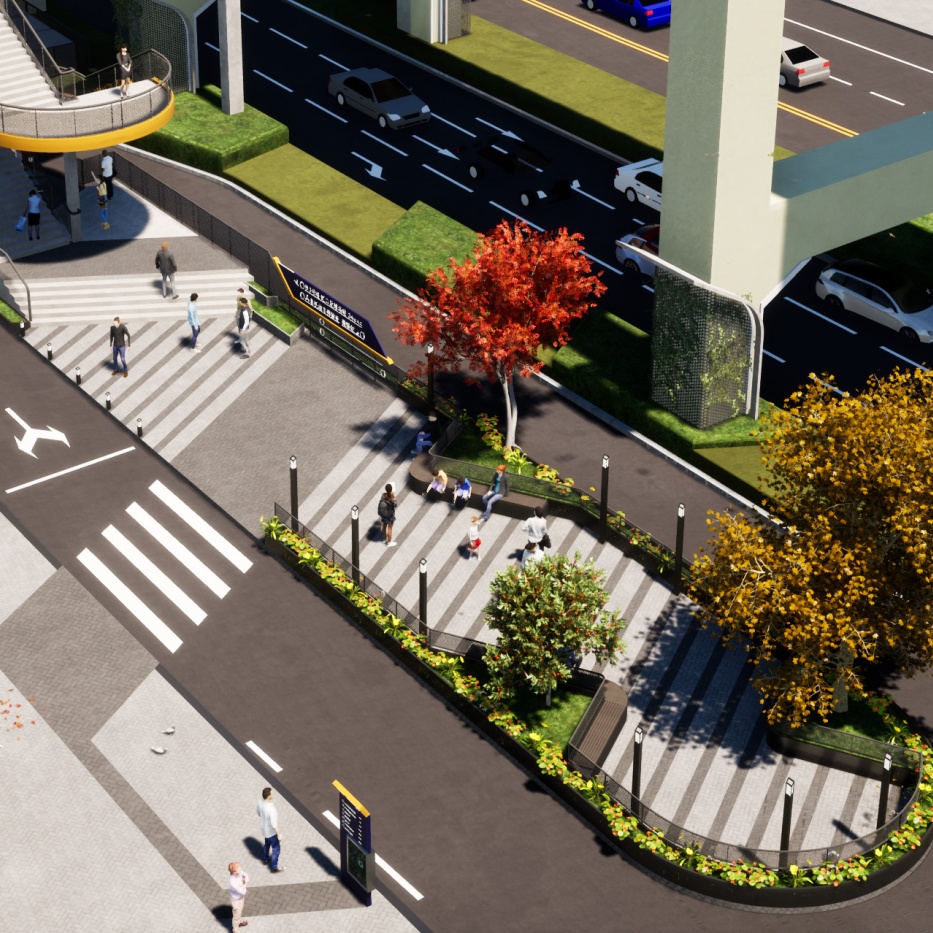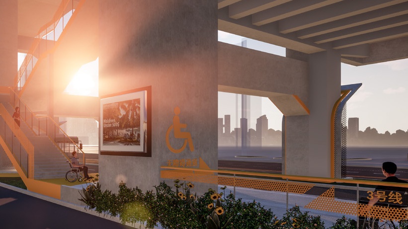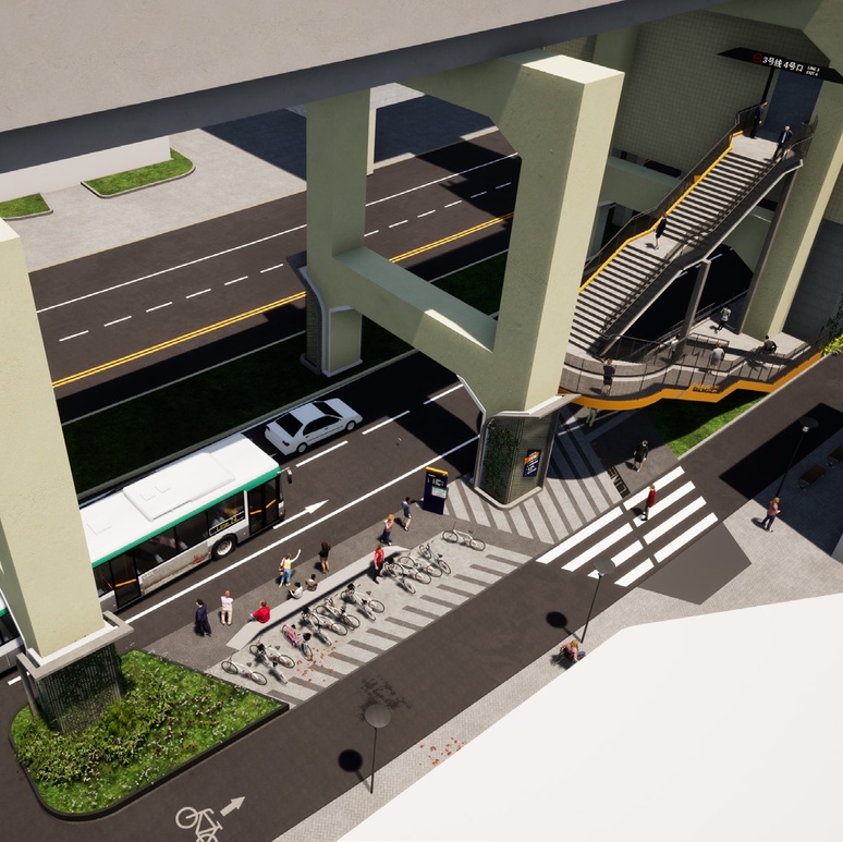 综上分析,方案对南北区采取不同的更新策略:南侧出入口的楼梯跨过现有非机动车道落在中岛上,中岛加宽作为人流缓冲,在端头设置驿站;调整北区楼梯段的距离和位置,减少对居民楼的影响,并形成更舒适的公交等候空间;此外,对区域的整体颜色、标识引导、楼梯扶梯、桥下照明的设置也做了相应的设计。