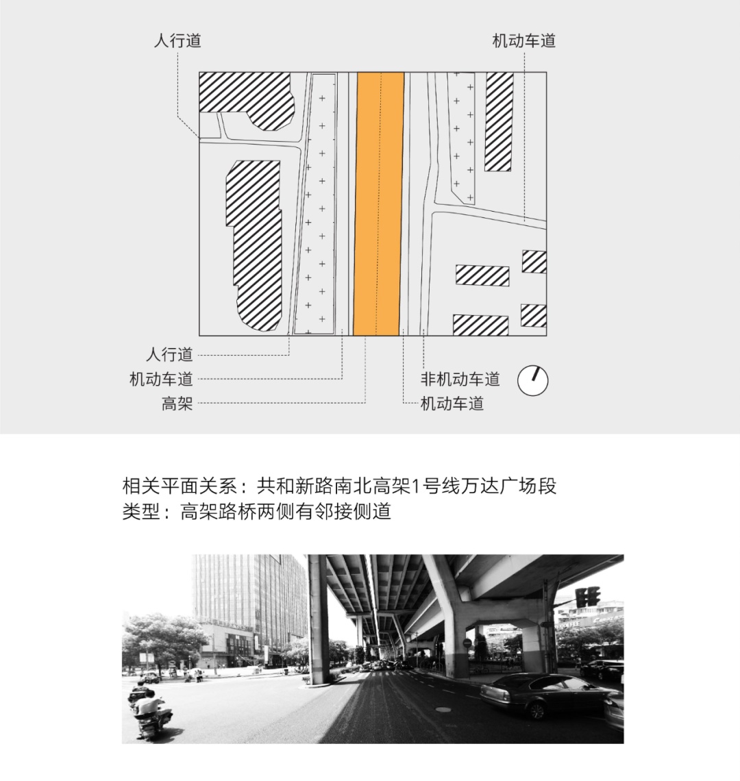 另一种是高架区间段的空间利用,目前机动车与非机动车停放、公交站点(如71路沿线)的设置已经比较常见,个别还有利用桥下空间设置运动场的空间复合利用。这些桥下空间的利用,在拥挤的城市交通中为市民提供了一种反差的体验,也打开了空间利用的可能性。