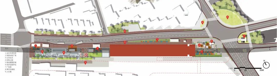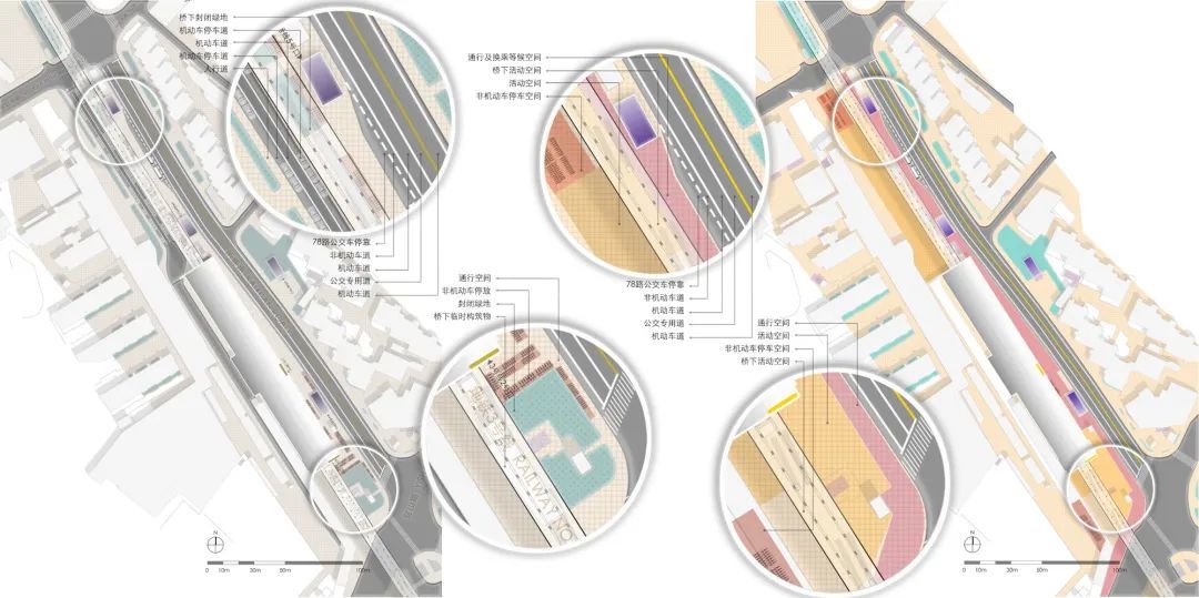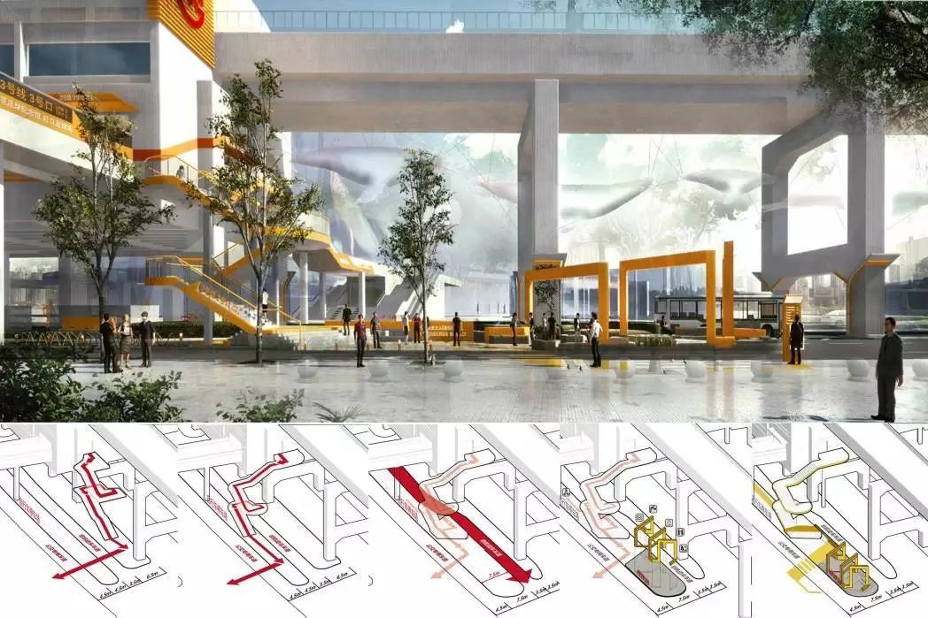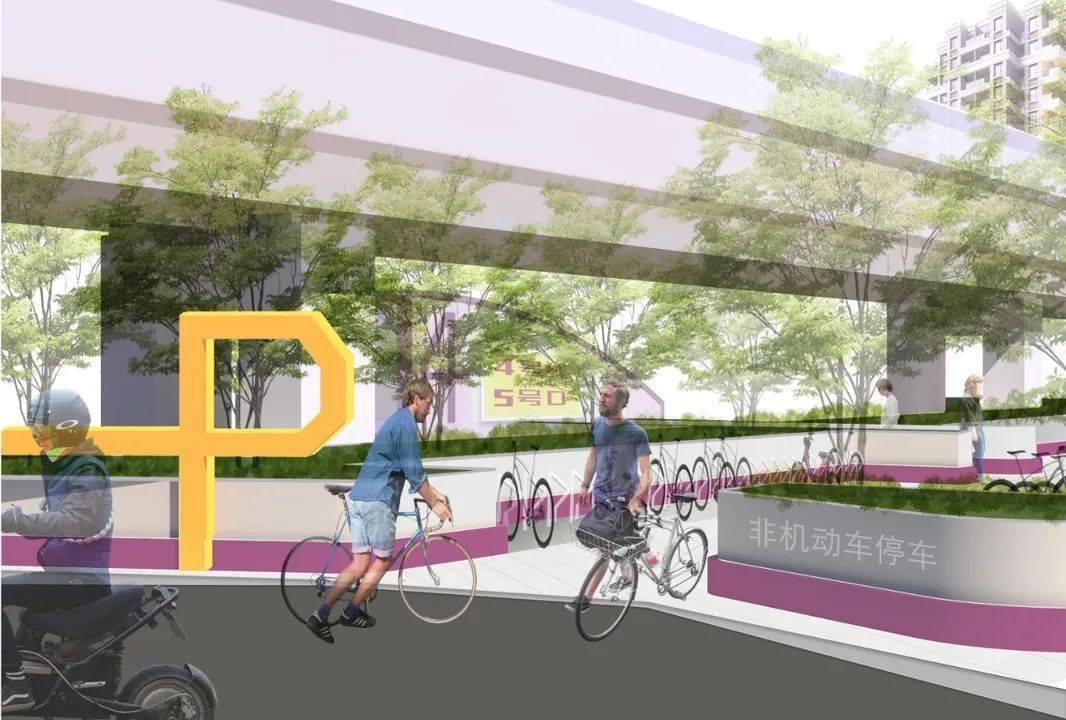 相应的“去色”策略是重新划分不同类型的停车区域,用充电设施引导电瓶车、自行车分开停放。在“赋色”的过程中整理场地,拓展空间,消除高差,用3、4、9号线颜色引导乘坐不同线路的人群。最后用铺装、景观、城市家具、商业设施为桥下空间“增色”。