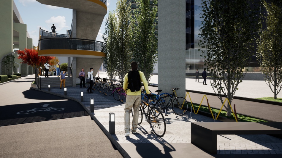 方案提出应在桥下空间创造一种反差的情境:让白领在午休或者下班后能有场景和行为上的切换。因而提出“超级跑道”的概念——两个长约400米的跑道/步道环绕场地,跑道围绕出的岛状空间作为基地两端的集散广场疏导人流,运用线性元素化解现状地形高差,并延续到南侧的市政用房提升方案中。建议在场地中增设售卖生鲜水果的自动售货机和快递柜,方便人群上下班时使用。