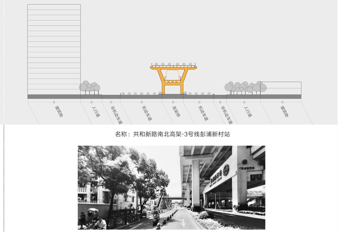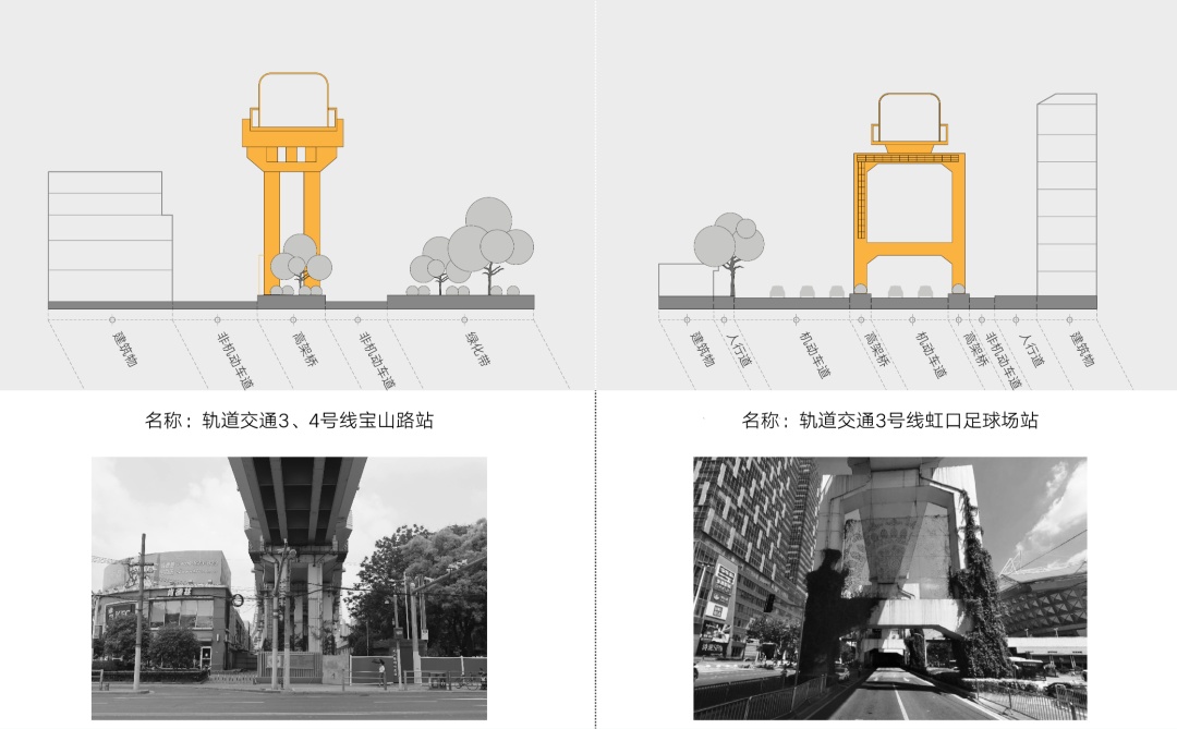 为了分析轨道交通桥下空间与周边城市空间的关系,我们对沿线29个站点及区间段进行了全面考察。自北向南,从友谊路站至龙漕路站主要为高架区间段,期间除了部分区间段因为途径上海火车站而转为地面。除轨道交通3号线以外,轨道交通1号线的部分区间段也采用高架轨道模式,并且与包括南北高架在内的基础设施重合,形成特殊的剖面关系。