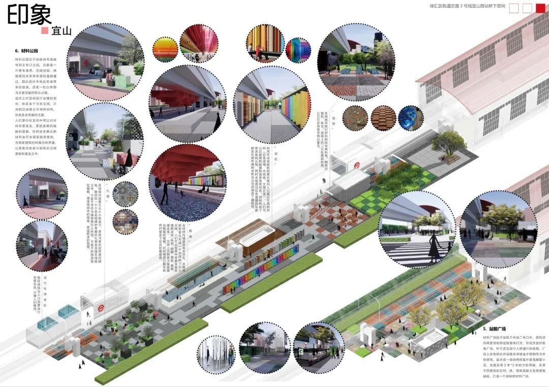 设计建议把宜山路、凯旋路交叉口一同纳入考虑的范畴,形成门户式的城市定位。接着重新梳理周边非机动车区域与地铁出入口、行人流线的关系,优化慢行系统和步行流线。对现有出地面的风井设施和地铁出入口加以改造,通过外包镜面不锈钢等材料使之变成公共艺术品。在改造南北两个广场时引入景观设计和建材展示,形成有特色的城市空间。