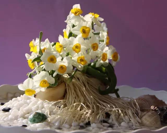 洗净切口处流出的粘液,覆盖一层脱脂棉,再置浅水盆中养护。一般经雕刻过的水仙,开花提早,花期缩短。