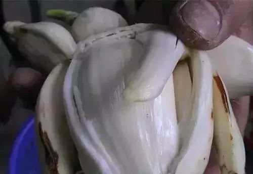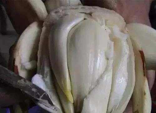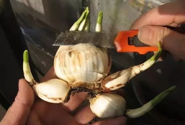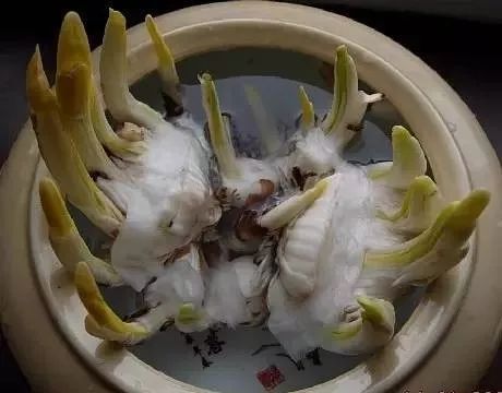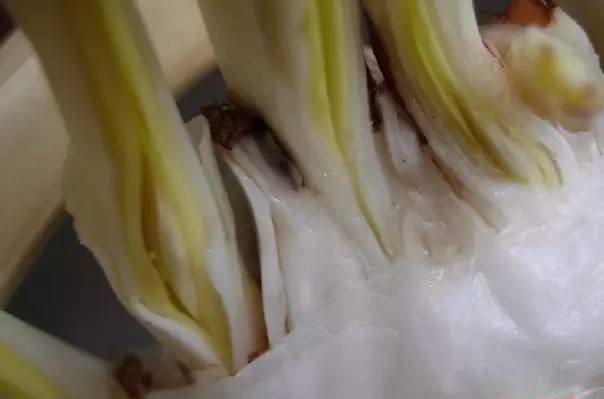 芽的外面包着两层白色、半透明的包衣,用刀从芽苞末端朝基部刻去芽苞片,让幼叶外露。