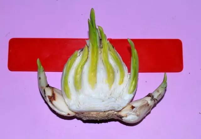 水仙花的叶片,原来都是笔直生长的,要想使叶片和花梗都长成弯曲的蟹爪状,就要对其削切。