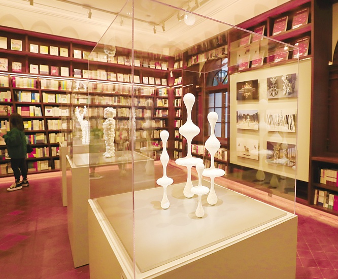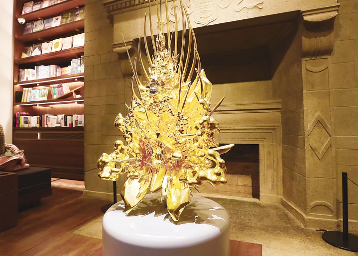 走入茑屋书店一楼,你也就站在了“历史的中心”,手边触手可及的是中国史和世界史的相关图书。“两端的壁炉旁的墙壁上,一边精选了哲学、文学类图书展现“世界的观念”,另一边通过版图、旅游类书籍展现“世界的疆域”。堪称镇店之宝、日本雕刻家名和晃平的作品《Throne》,与壁炉的背景十分契合,这也是该作品在中国大陆首次展出。