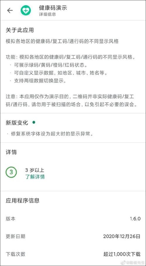 开发者对于此应用的描述是,“模拟各地区健康码、复工码、通行码的不同显示风格”。功能上,该APP不仅能够展示不同健康码,还可展示绿码、黄码、橙码、红码状态,并可自定义显示数据,如地区、城市、姓名等。
