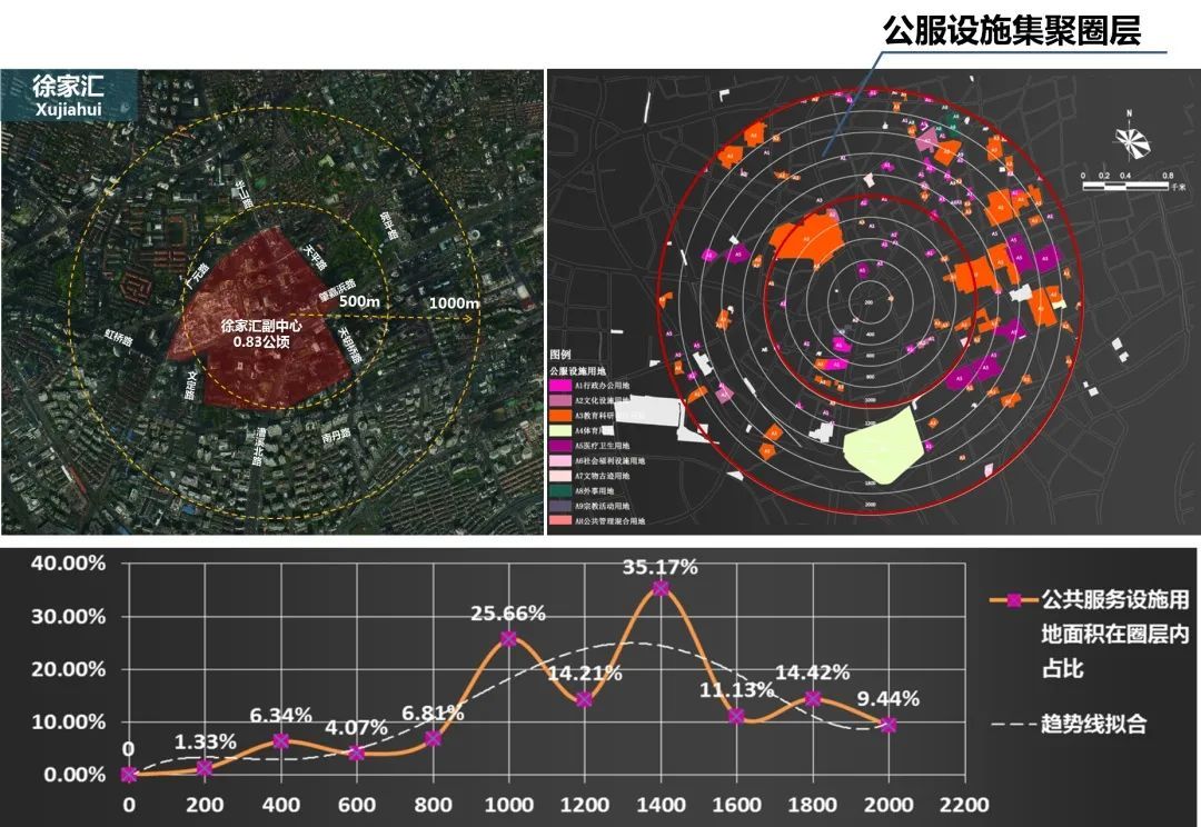 二是提出城市副中心存在核心区及功能区两个不同空间层次。研究发现副中心在距离核心1000—1500m的范围,存在一个公共服务设施高度集聚的副中心功能区,是副中心重要的功能组成和活力来源,它与传统认知中以商业商办集聚、高强度开发为特征的核心区共同组成了城市副中心。