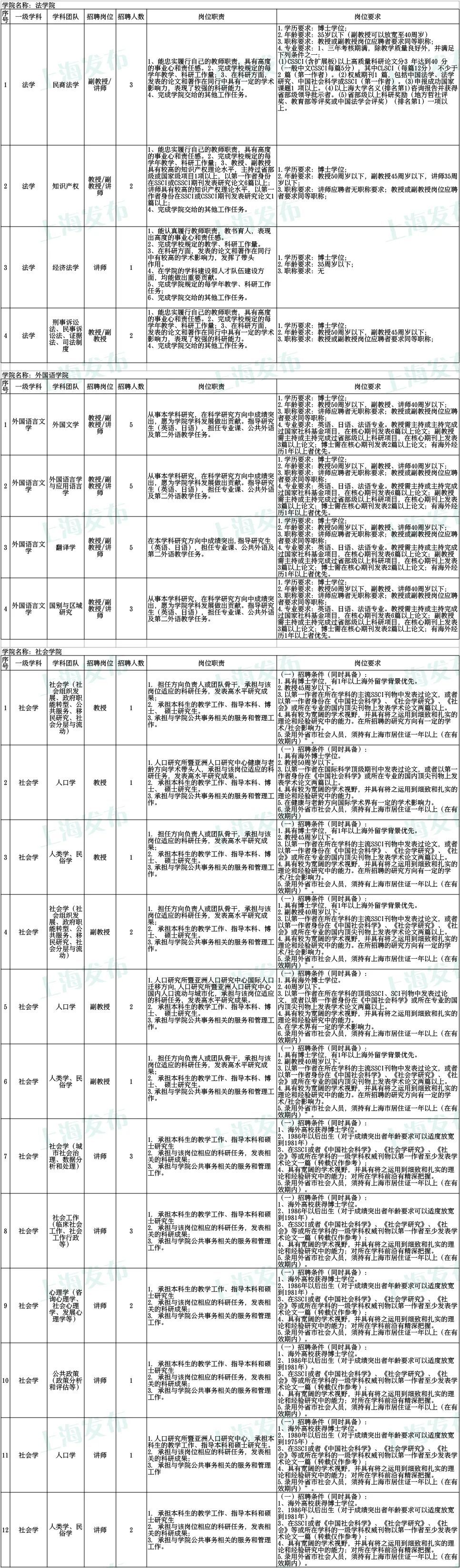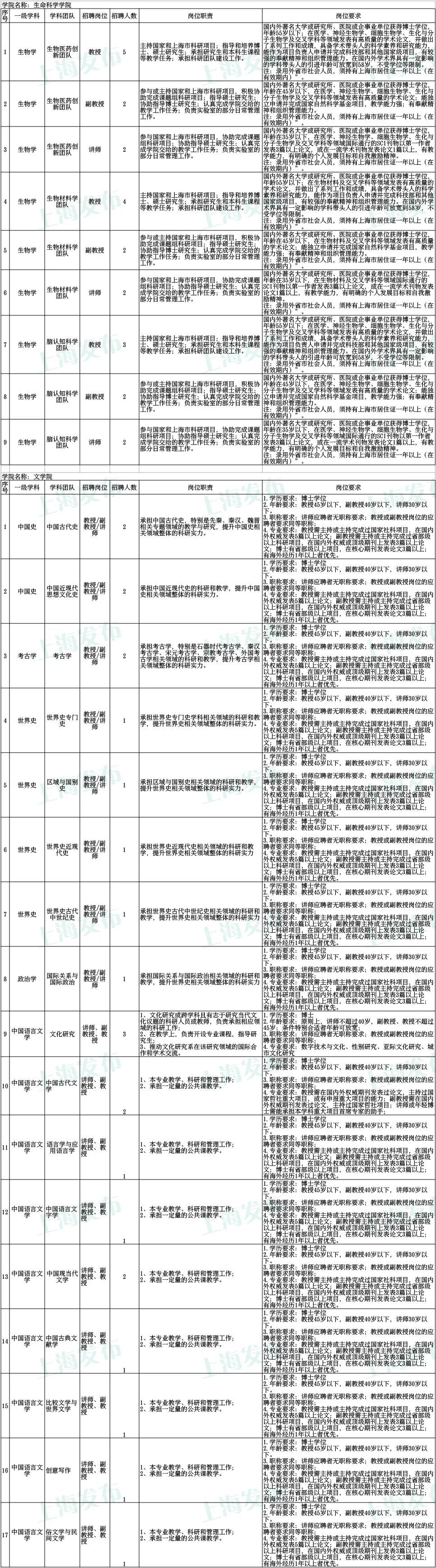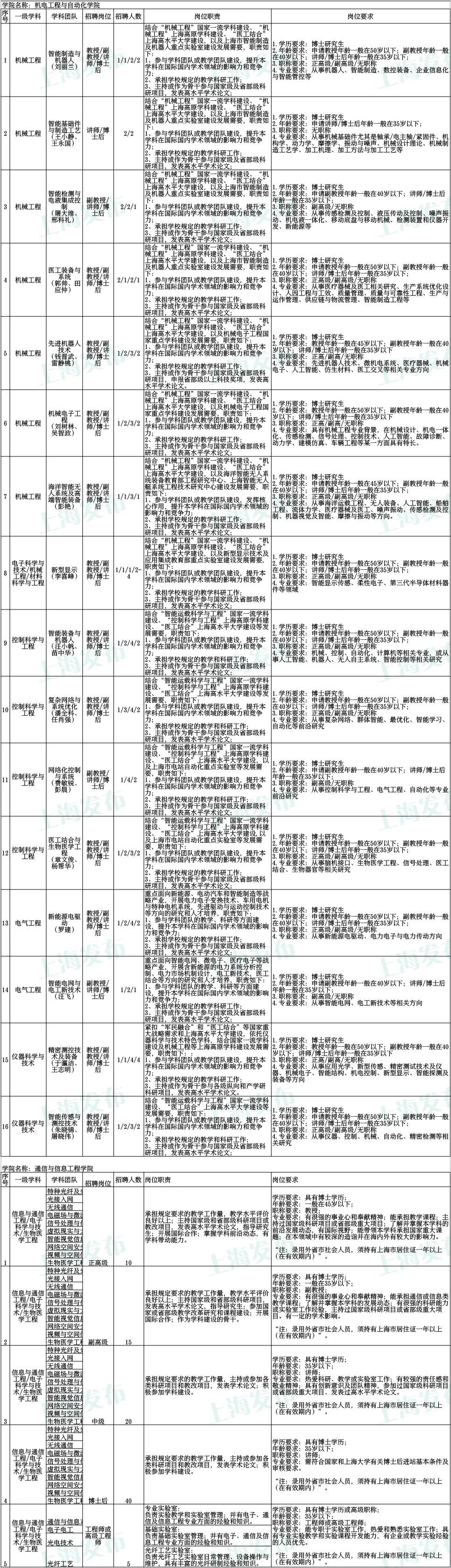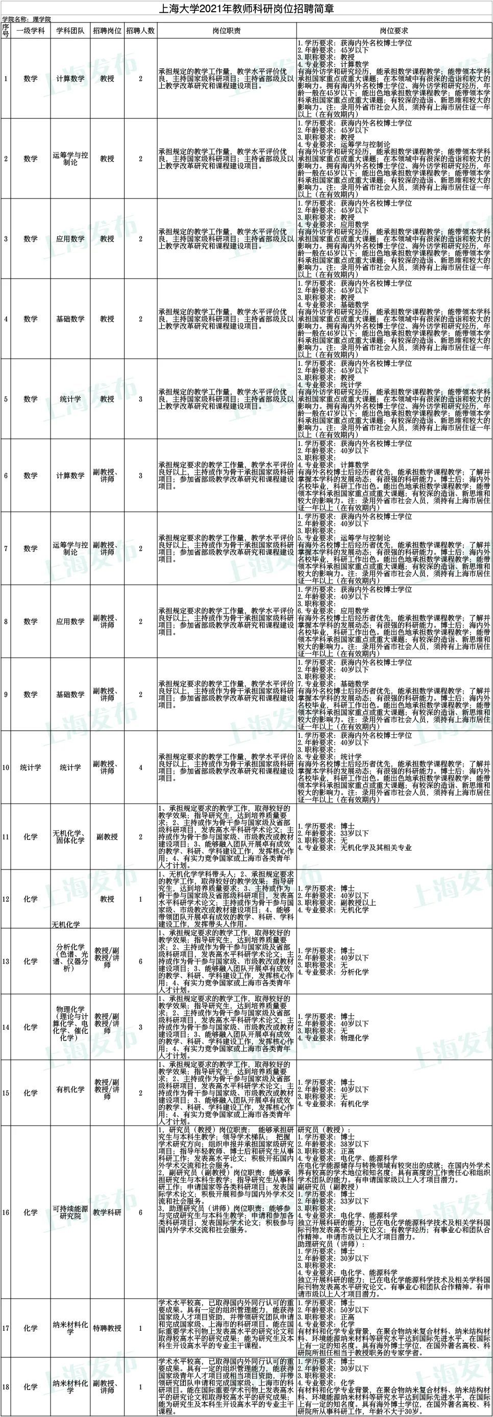 教师岗位:除体育、艺术、小语种等个别岗位,应具有博士学位,身体健康,品德良好,有较强的科研能力。具体要求见上海大学招聘网站。