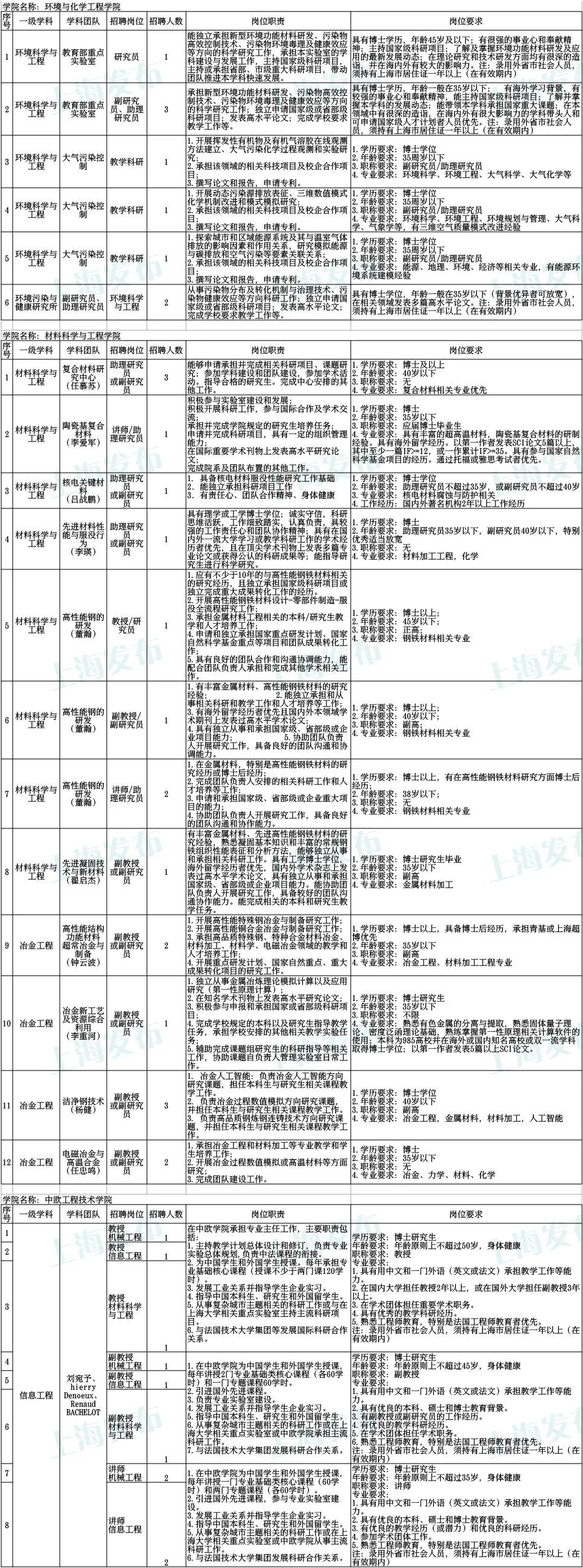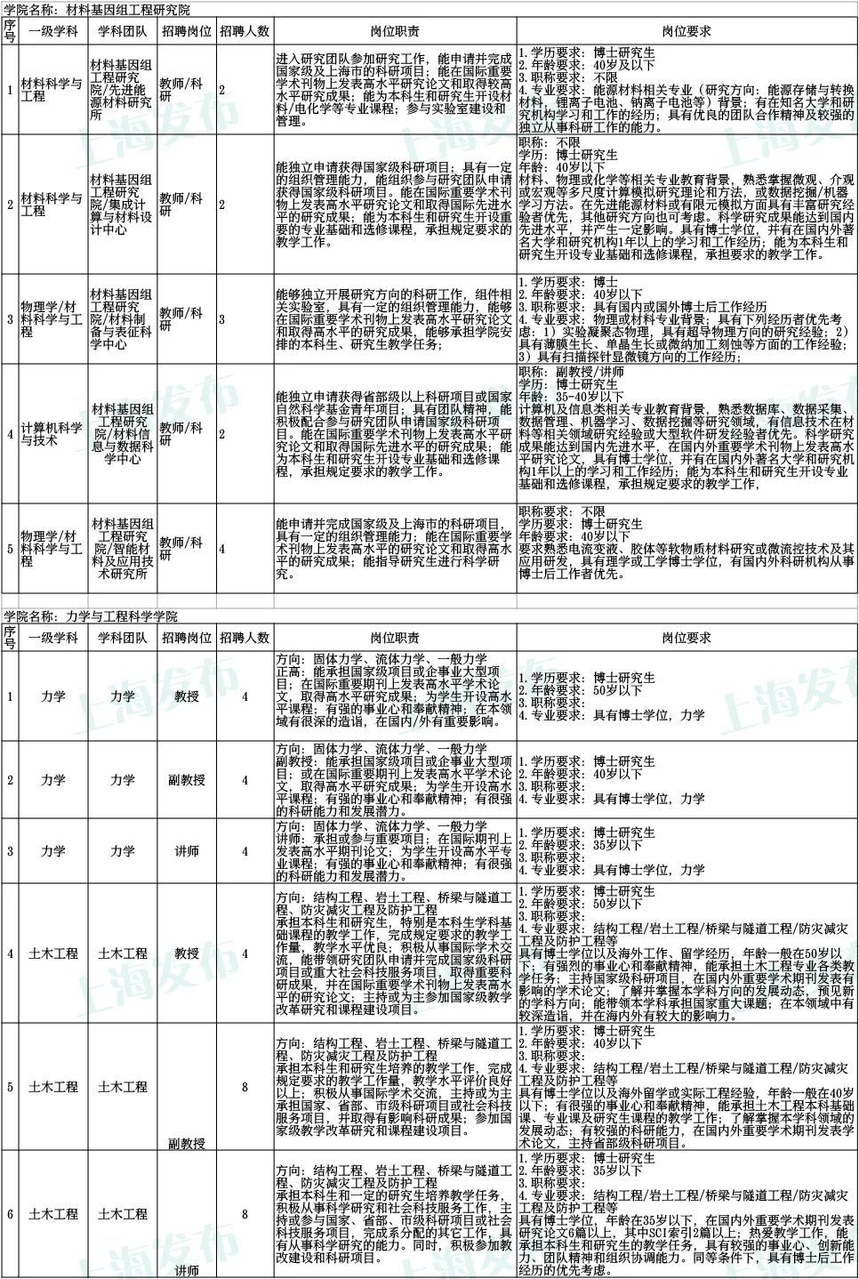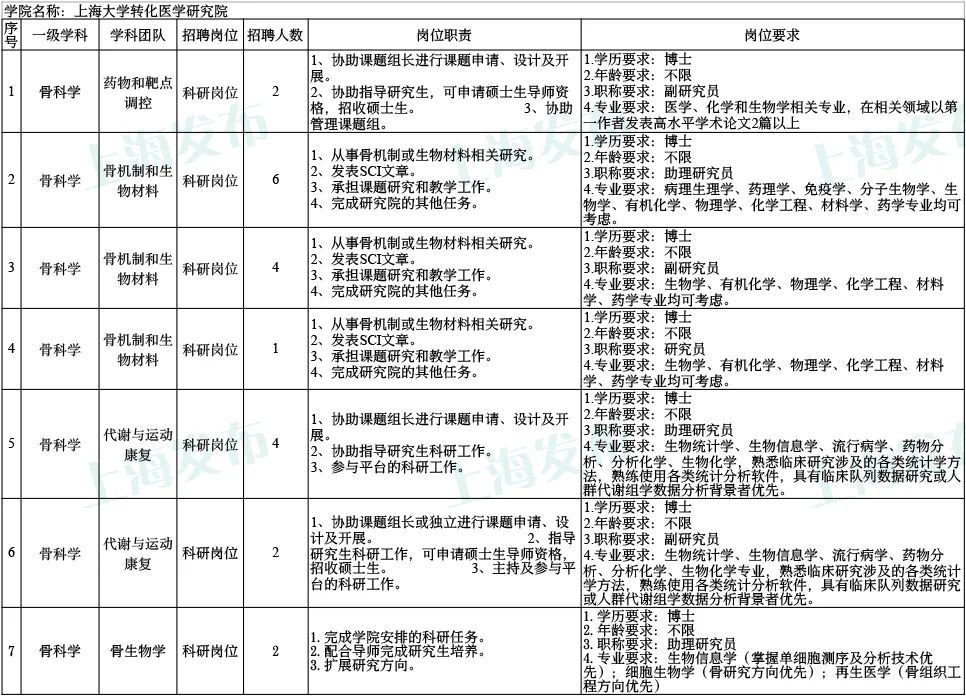 科研岗位:具有博士学位,承担规定要求的教学和科研工作。具体要求见上海大学招聘网站。