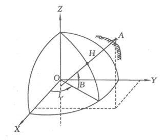 无论是参心坐标系还是地心坐标系均有两种表现形式:空间直角坐标系(以X、Y和Z表示坐标元素)和大地坐标系(以纬度B、经度L和高度H表示坐标元素)。如图所示。