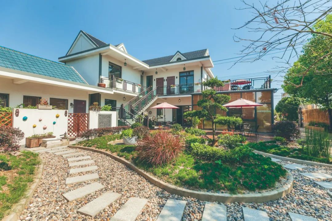 “也山花园”民宿位于崇明区建设镇,毗邻东平国家森林公园——2021年花博会主场馆所在地。女主人用一年时间精心打造,呈现了全新的气质,主建筑面向运粮河邻水而立,前面是广袤的田野和林地,后面有十亩私家草坪,水岸河边竹林飞鹭,菖蒲花团团簇簇,四季皆有赏味,庭院曲折而进,设计精巧秀美。